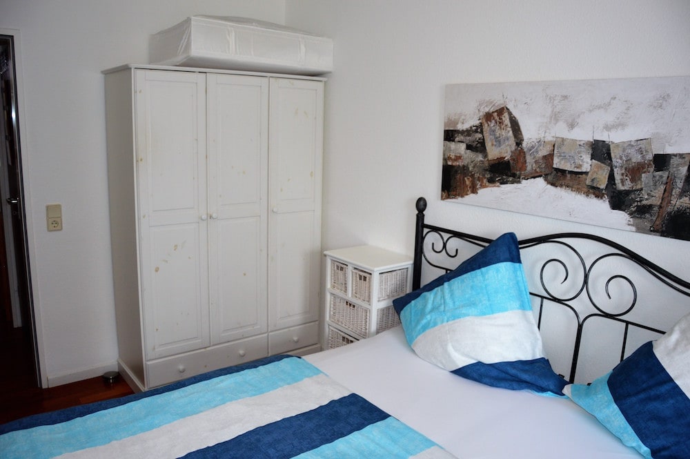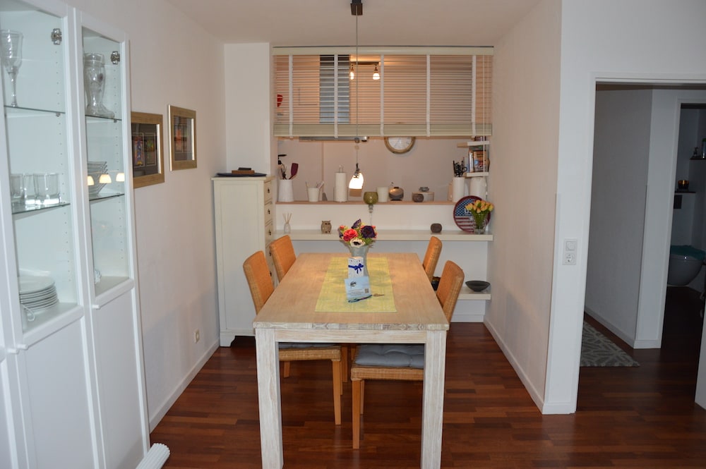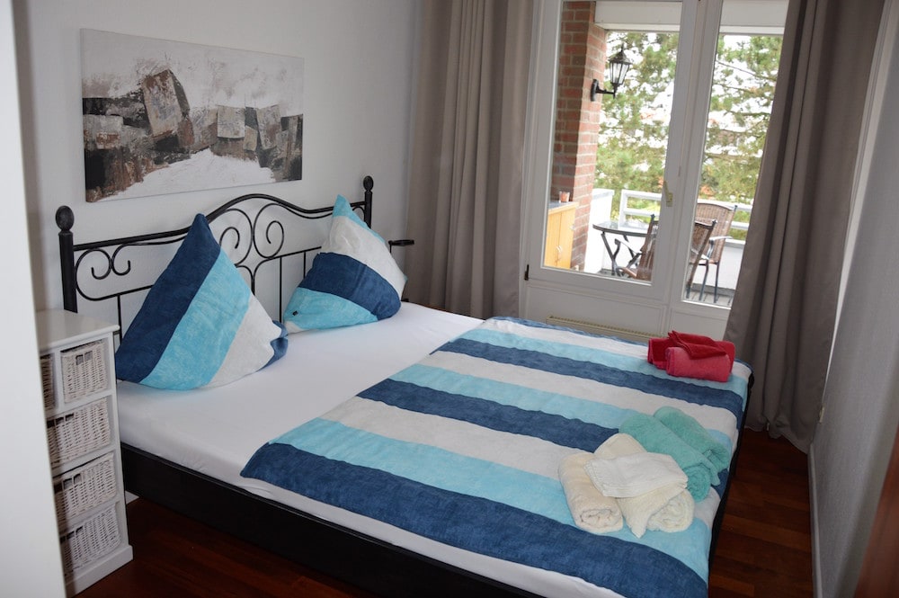 Die Ferienwohnung befindet sich im 2ten OG (es gibt ein Fahrstuhl im Haus). Sie verfügt über ein kombiniertes Wohn- und Esszimmer inkl. einer Schlafcouch. Die Küche ist mit einer Einbauküche mit Geschirrspüler, Herd mit Backofen und Mikrowelle ausgestattet. Das Schlafzimmer verfügt über ein Doppelbett (180×200 m). Weiterhin gibt es ein großzügiges Bad mit einer Badewanne mit Duschabtrennung, WC und Fön.